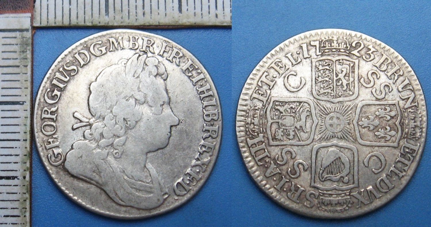 - 1723 - 1 shilling, stříbro - Jiří I., Velká Británie, SSC varianta byla ražena stříbrem objeveným South Sea Company v Indonésii