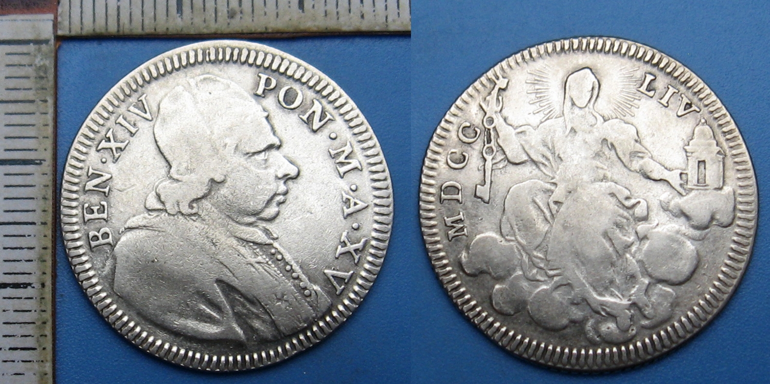 • 1754 / XV - 2 giulio, stříbro - Benedikt XIV., Vatikán, Řím
