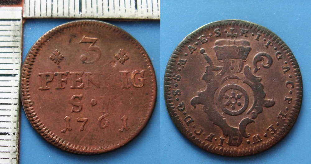 1761 SM - 3 pfennig - biskupství Mainz, Johan Friedrich Karl
