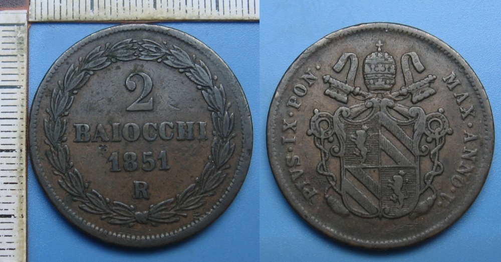 • 1851 R / V - 2 baiocchi - Pius IX., Vatikán, Řím