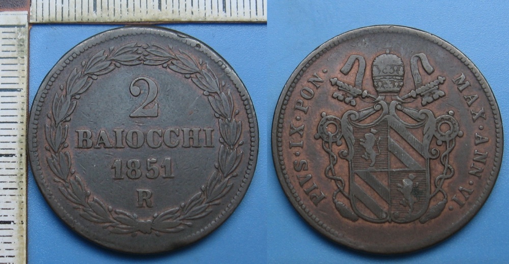 • 1851 R / VI - 2 baiocchi - Pius IX., Vatikán, Řím