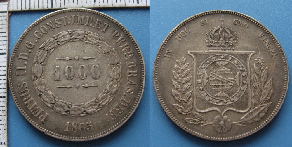 • 1865 - 1000 reis, stříbro - Brazílie, Petrus II.