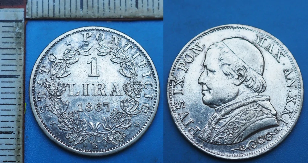 • 1867 R / AN XXI - 1 lira, stříbro - Pius IX., Vatikán
