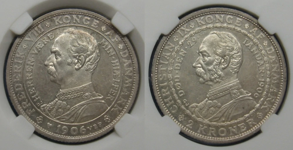 1906 - 2 kroner, stříbro - Dánsko, Christian IX., Frederik VIII., výroční, certifikace CCG AA483830 MS60Skladem1 550 Kč/ ks