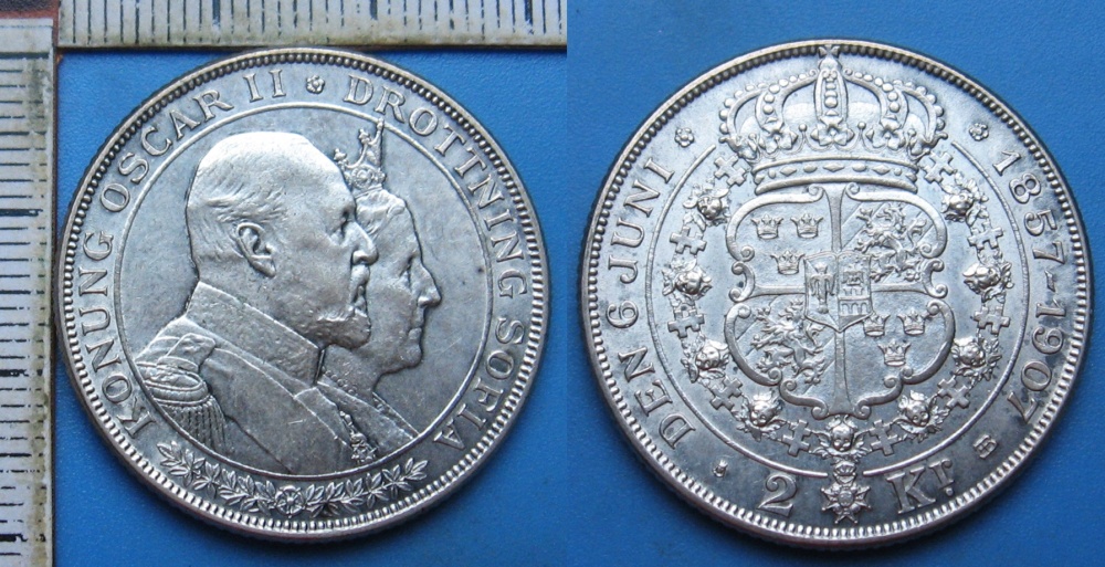 1907 EB - 2 kronor, stříbro - Oscar II., Švédsko, výročí zlaté svatby