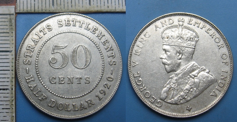 1920 - 50 cents, stříbro - Straits Settlements, Jiří V., pěkný