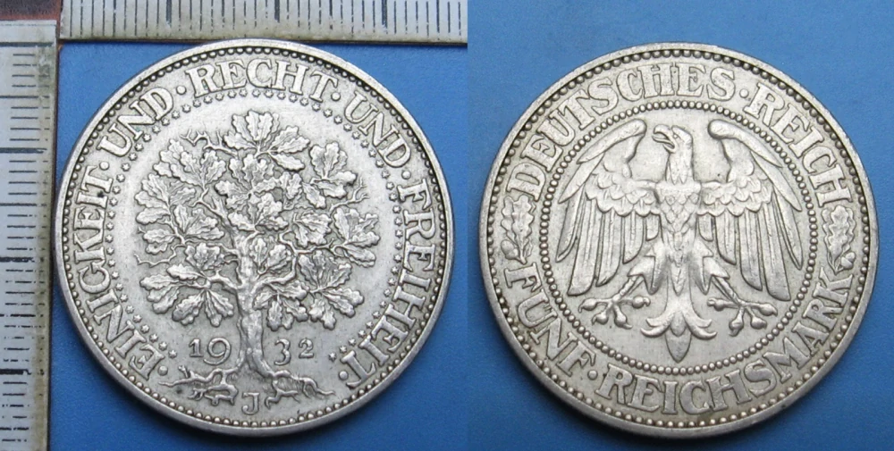 1932 J - 5 reichsmark, stříbro - Německo, Weimar, dub