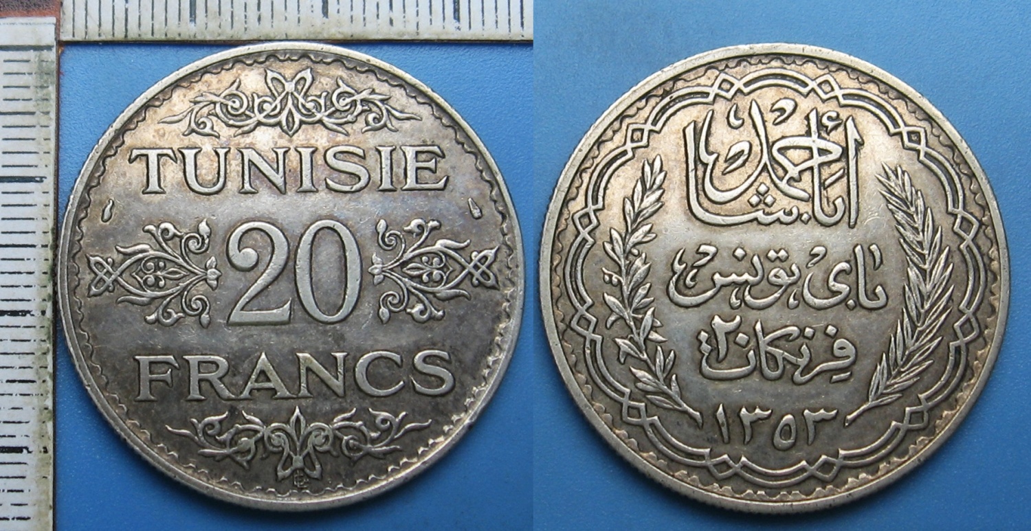 1935 AH 1353 - 20 francs, stříbro - Tunis, Ahmad II.