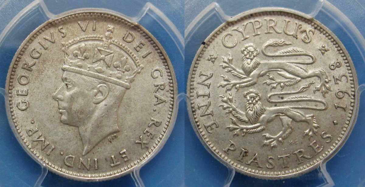 1938 - 5 piastres, stříbro - Britský Kypr, Jiří VI., kapsle PCGS AU55Skladem1 385 Kč/ ks