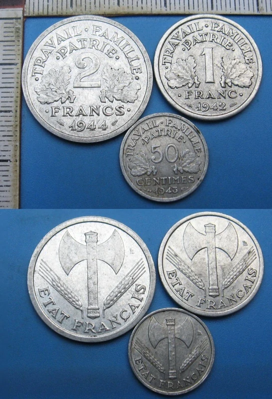 1943,42,44 - 50 centimes, 1 franc, 2 francs - 3x válečná Francie