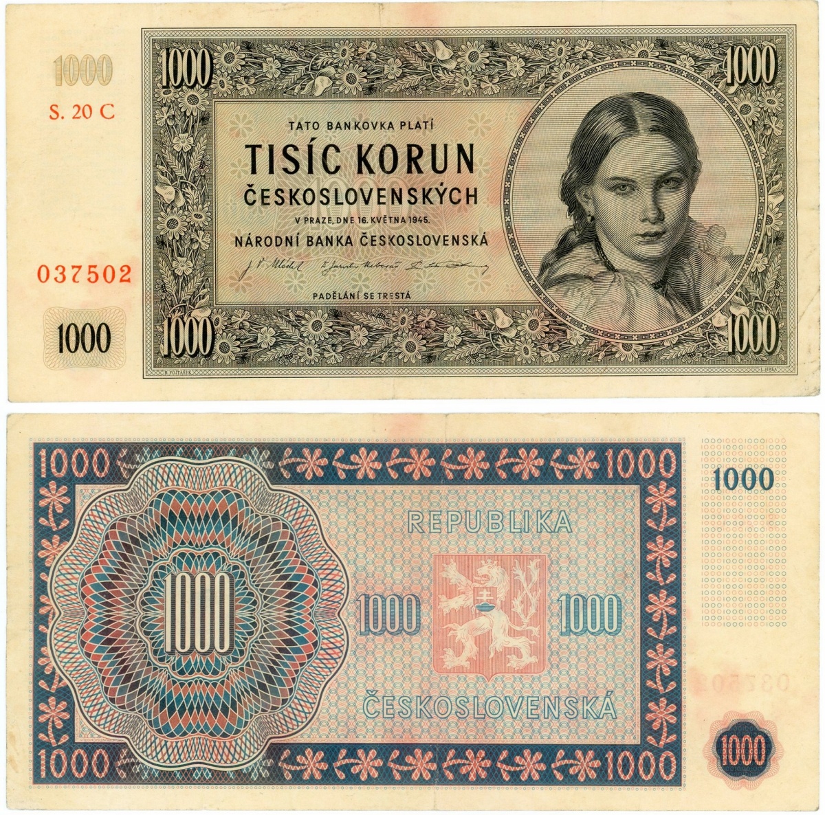1945 - 1000 korun, bankovka, S,20C 037502 - Československo, pěkná