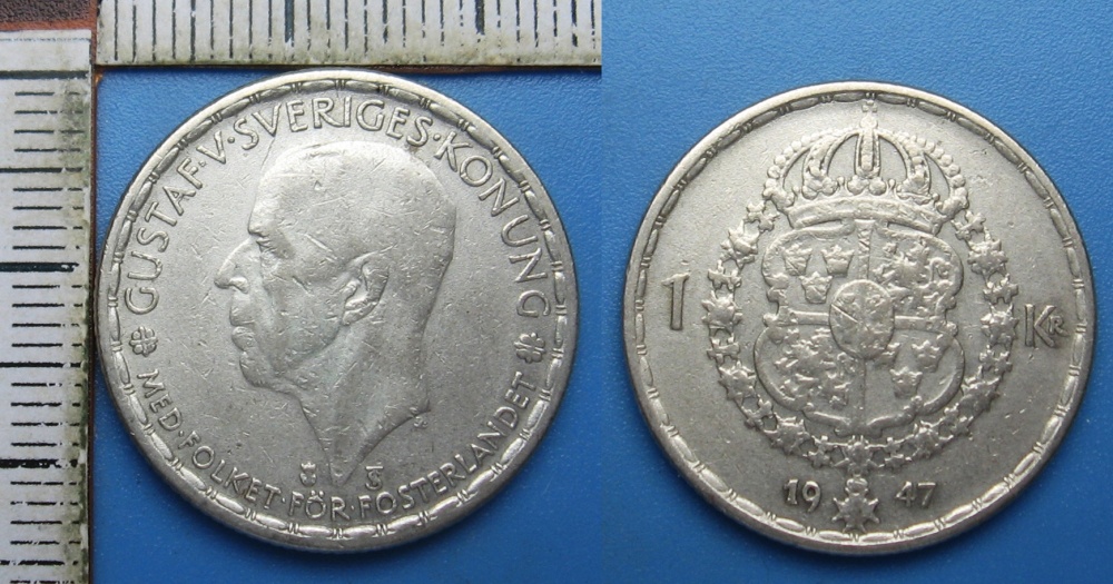 • 1947 TS - 1 krone, stříbro - Gustaf V., Švédsko