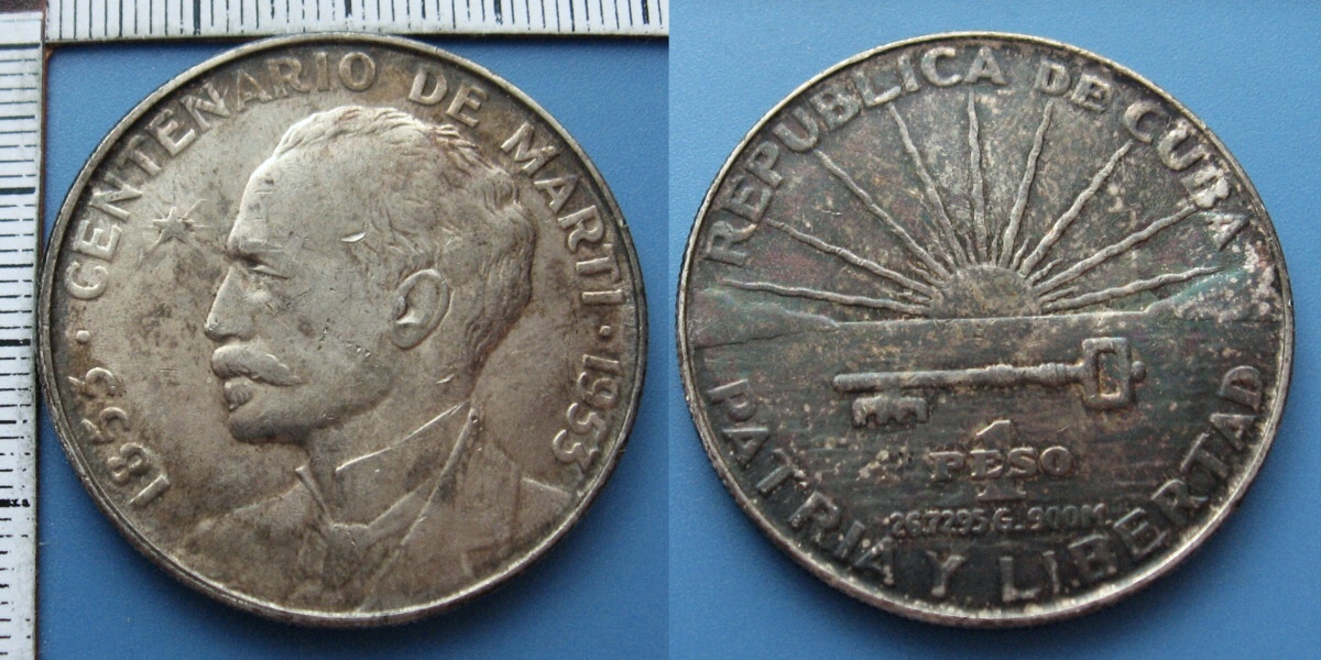 1953 - 1 peso, stříbro - Kuba, Centenario de Martí, patina