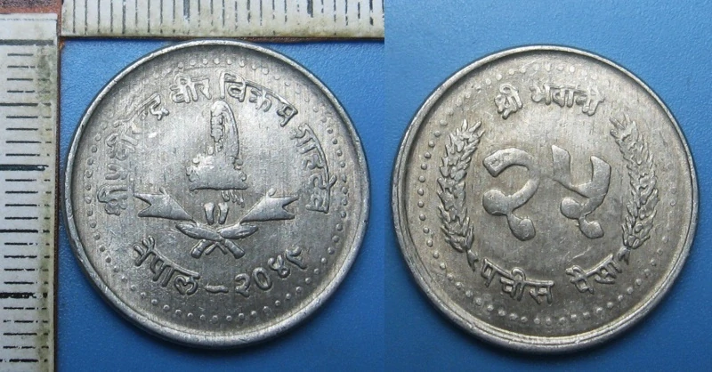 4. 1971-2001 - 25 paisa - Nepál, Birendra Bir Bikram