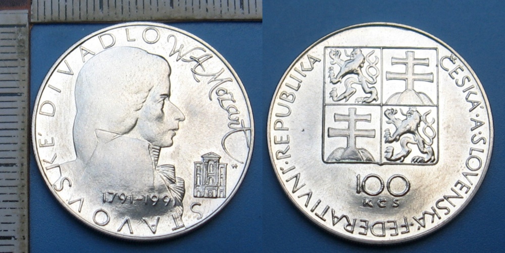 - 1991 - 100 Kč, stříbro - 200 let úmrtí Wolfganga Amadea Mozarta