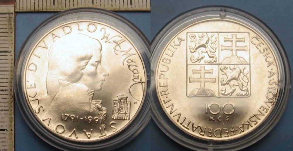 - 1991 - 100 Kč, stříbro - 200 let úmrtí Wolfganga Amadea Mozarta, kapsle
