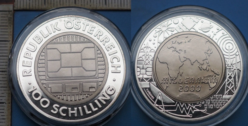 2000 - 100 schilling, PROOF, stříbro s titanovým středem - Rakousko, kapsleSkladem1 595 Kč/ ks