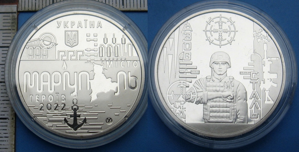 Nikl Brass, Proof, 16,59 g, 35 mm; Avers: Nahoře nápis "УКРАЇНА", pod nímž je malý státní znak Ukrajiny; kompozice symbolizující město hrdinů: průčelí činoherního divadla pod pistolí (vlevo), stylizované stavby Azovstalu, na kterých létají bomby (vpravo); na matném podkladu zrcadlové nápisy: "МІСТО/ МАРІУПОЛЬ/ГЕРОЇВ/2022", v pravopisu slova "Mariupol" je písmeno "i" nahrazeno svíčkou jako symbol památky na zemřelé, písmeno "o " je napodobena mapou města vytvořenou ze dvou profilů - dětského a dospělého, jako symbol nucené deportace; dole je na pozadí stylizovaných vln kotva - jeden z heraldických prvků na erbu Mariupolu, jako obraz naděje na osvobození a obrodu ukrajinského města; logo mincovny Národní banky Ukrajiny (vpravo dole); Revers: Obraz ukrajinského vojáka; kolem válečníka jsou stylizované úlomky, zbraně, zaměřovací kříž a svislý nápis "АЗОВ" (vlevo nahoře) "СТАЛЬ" (vpravo dole) - Azovstal, který se stal poslední kapsou organizovaného odporu v obležení do 16. dubna. Designed by Maryna Kuts; Rytci: Volodymyr Atamanchuk, Yurii Lukianov
